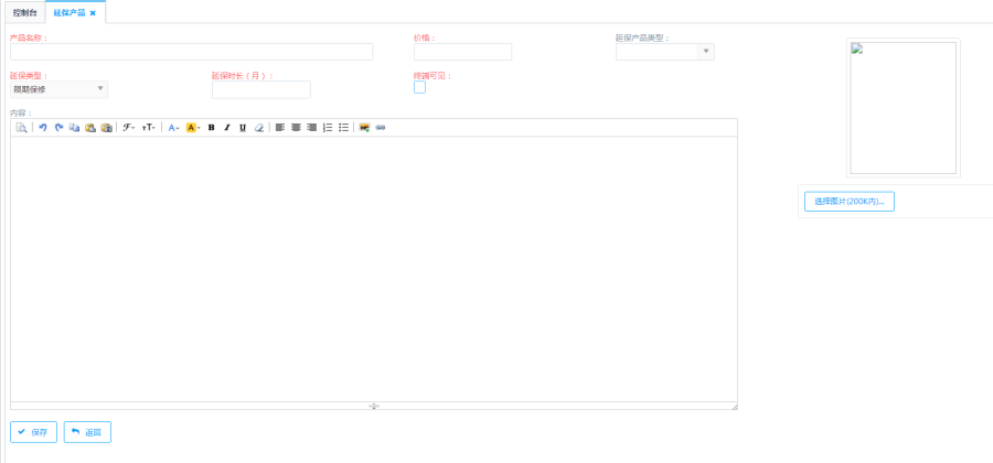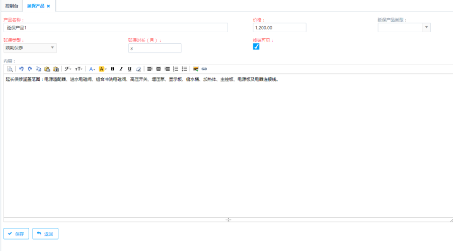 点击列表上方<创建>按钮,进入到延保产品的创建页面。输入延保产品信息后,点击下方的<保存>按钮,可新增延保产品信息。