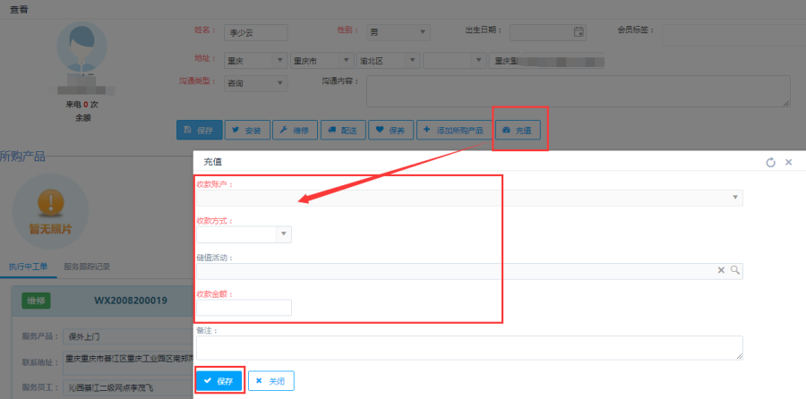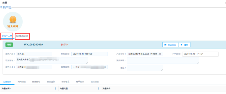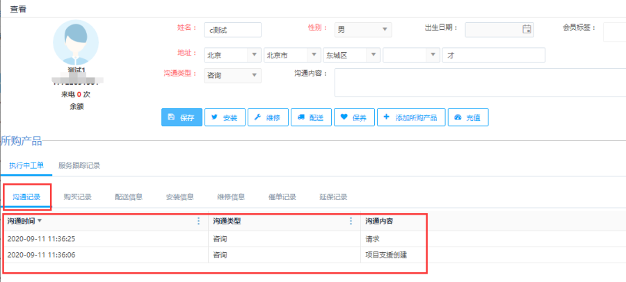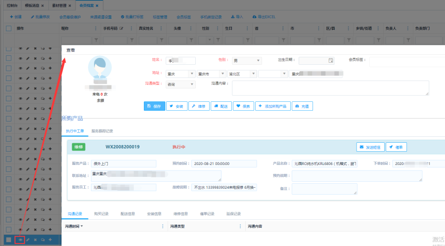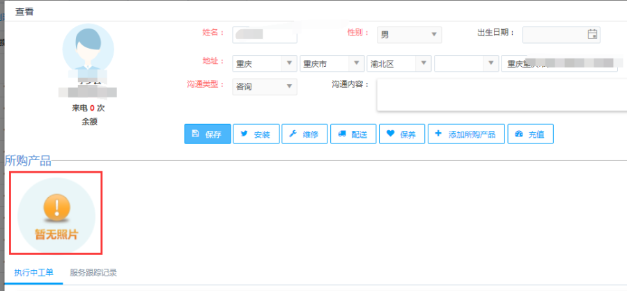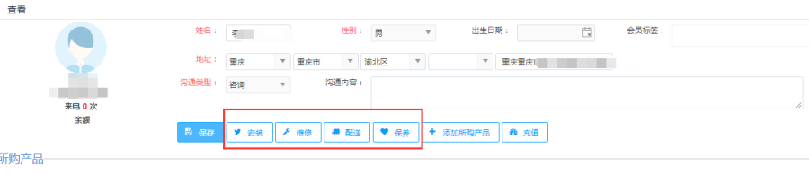 点击<查看>按钮,查看当前会员信息详情。查看界面显示两部分,一部分显示客户详情,包括客户电话、地址和沟通类型,可以对这些信息进行修改。一部分显示客户所购产品,包括执行中工单和服务跟踪记录。
