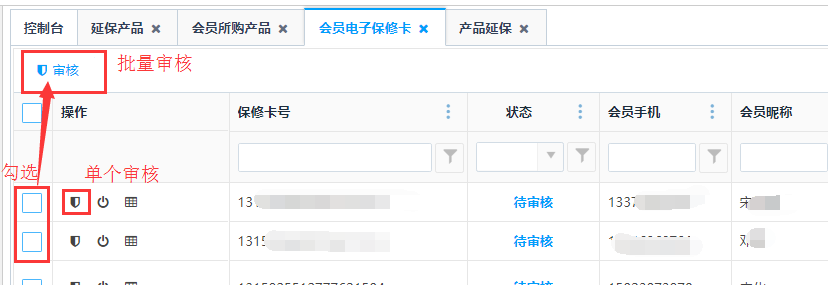 点击操作栏中的<审核>按钮,可对电子保修卡进行审核操作;勾选待审核的保修卡,点击上方的<审核>按钮,可对电子保修卡进行批量审核操作。