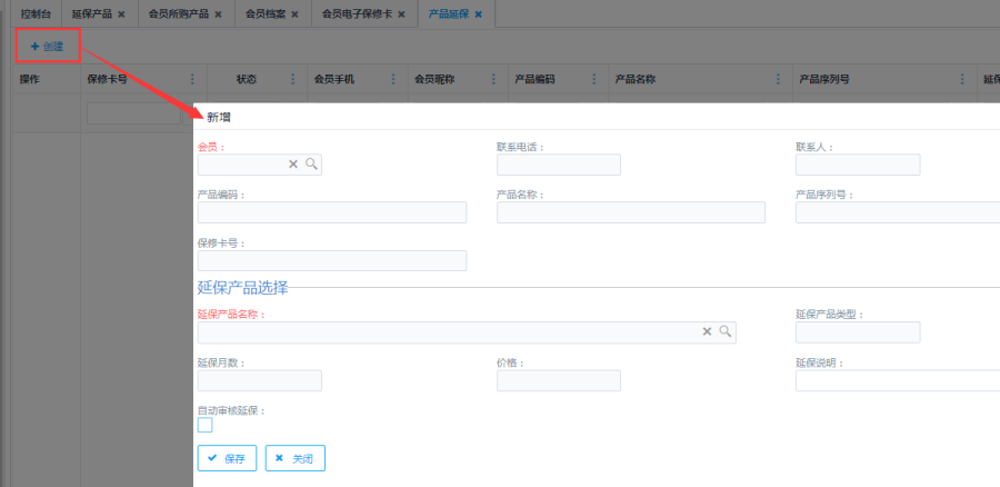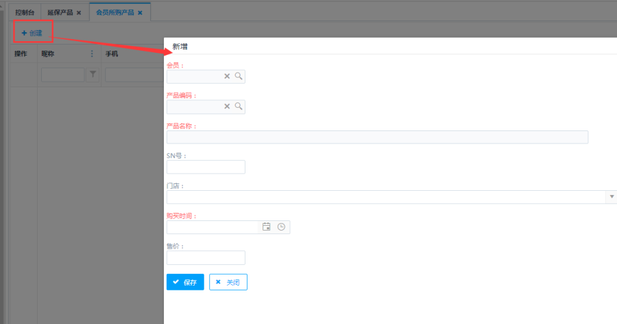 点击列表上方<创建>按钮,进入到会员所购产品的新增页面。输入会员和产品信息后,点击下方的<保存>按钮,成功新增会员所购产品。新增产品后,会员档案查看该会员时可以查询到该会员所购产品信息。