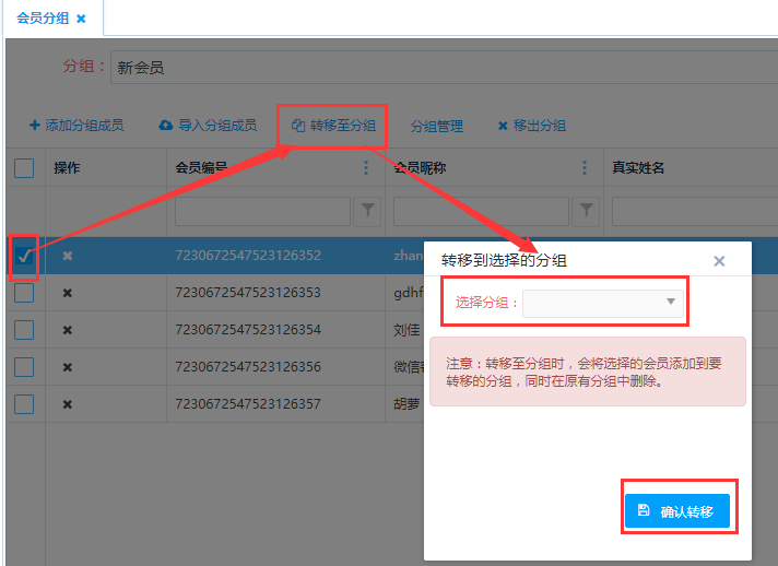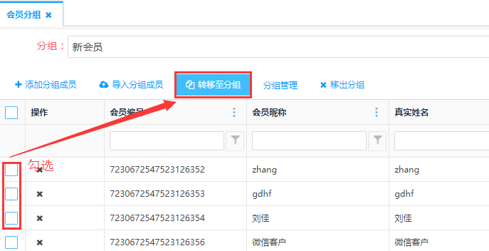 勾选需要移至其他分组的会员信息,点击上方的<转移至分组>按钮,可把当前会员移至到其他分组