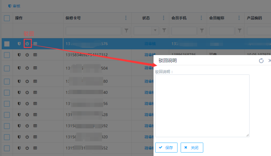 点击操作栏中的<驳回>按钮,可对电子保修卡进行驳回操作;