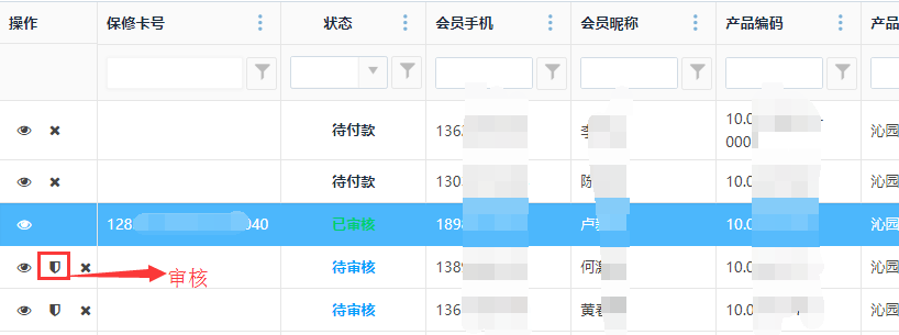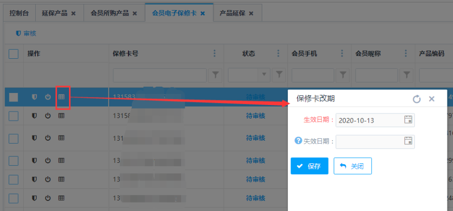 点击<审核>按钮,可对产品延保进行审核操作,审核后状态变为已审核并且显示保修卡号。