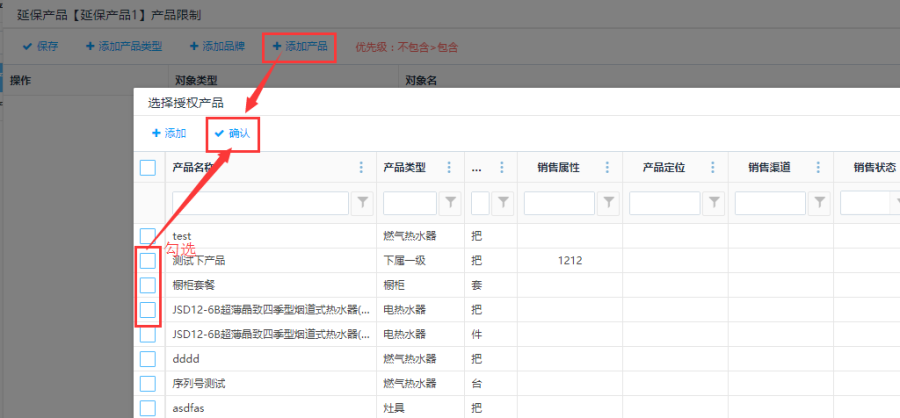第二步:以"添加产品"为例:点击<添加产品>按钮,弹出选择授权产品界面,勾选产品,点击<确认>按钮,成功添加授权产品;点击<删除>按钮,可以删除授权产品,