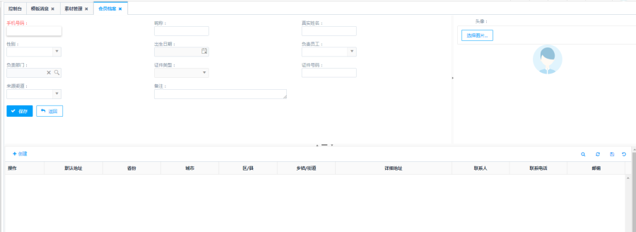 以"手动创建"为例:点击列表上方<创建>按钮,进入到会员的创建页面。输入会员信息后,点击下方的<创建>按钮,可以添加会员地址信息。点击右边的<选择图片>,可上传头像。信息填写完毕点击<保存>按钮,会员档案创建成功。