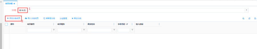 第一步:点击分组下拉框选择一个分组,然后点击<添加分组成员>按钮,弹出会员管理界面