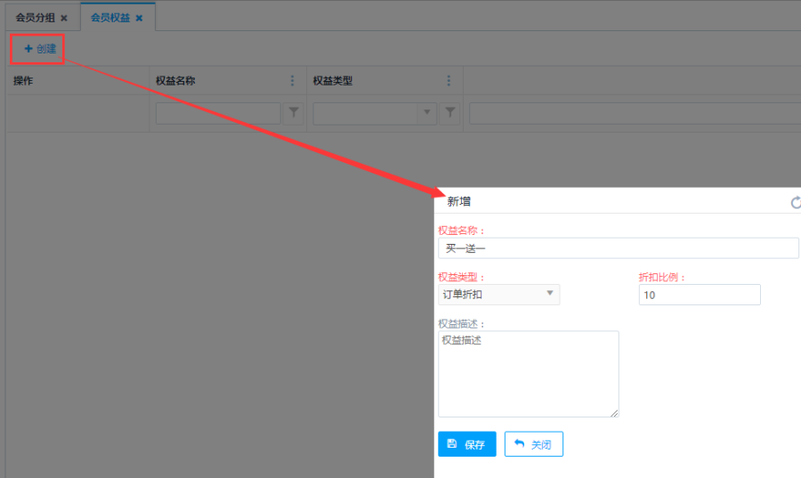 点击列表上方<创建>按钮,进入到会员权益的创建页面。填写信息后点击保存,会员权益创建成功。