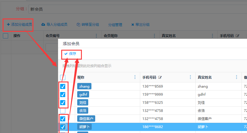 第二步:会员管理界面,勾选需要分组的成员,点击<保存>,添加会员成功后这个分组下有这些会员。