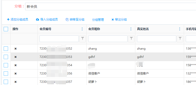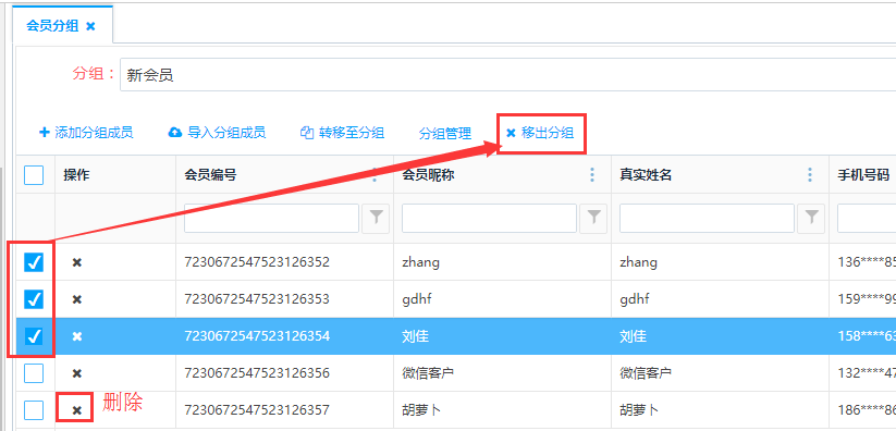 批量勾选会员信息,点击上方的<移除分组>按钮,可批量把会员移除分组;点击操作栏的<删除>按钮,可单独把会员移除分组。
