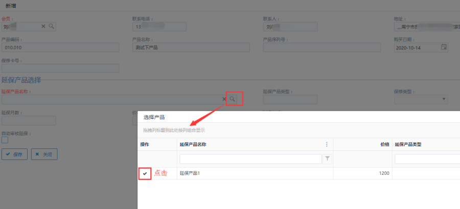 第三步:点击延保产品名称,选择延保产品,选择后自动带出延保产品信息,查看信息后点击<保存>按钮,产品延保创建成功。