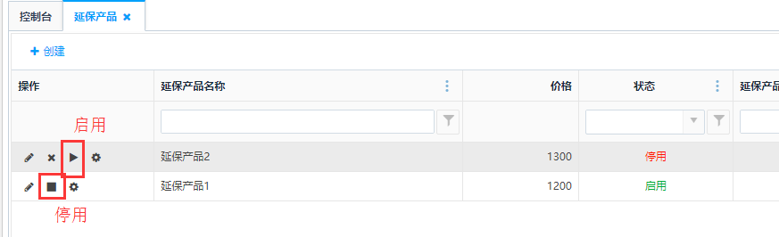 点击操作栏中的<启用>按钮,可对延保产品进行启用操作;点击<停用>按钮,可以对延保产品进行停用操作。