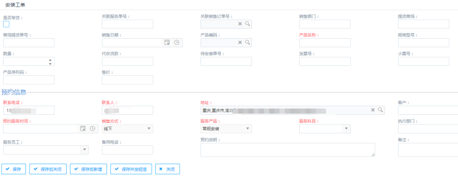 第一步:点击查看界面上的安装/维修/配送/保养按钮,会跳转到对应的安装工单/维修工单/配送工单/保养工单界面,填写信息后点击保存按钮,会生成安装工单/维修工单/配送工单/保养工单。具体操作参考"服务"模块。