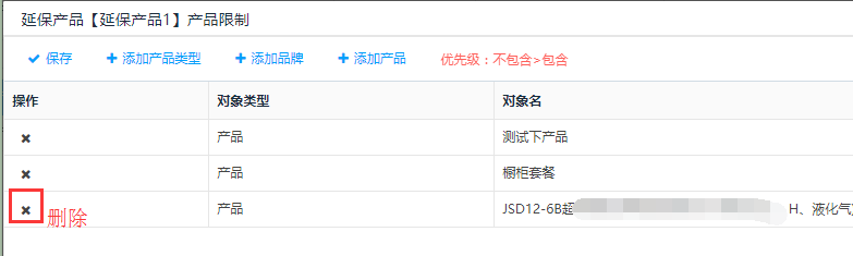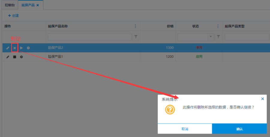 状态为"停用"的延保产品,点击操作栏中的<删除>按钮,可对延保产品进行删除操作。