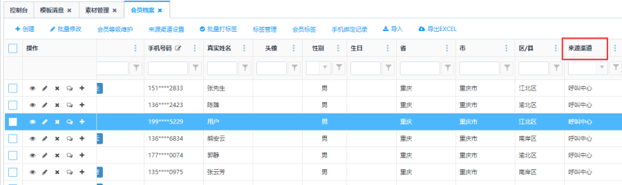 - 会员档案的来源渠道:销售订单、服务中心、零售订单、呼叫中心、微信公众号和手动创建。