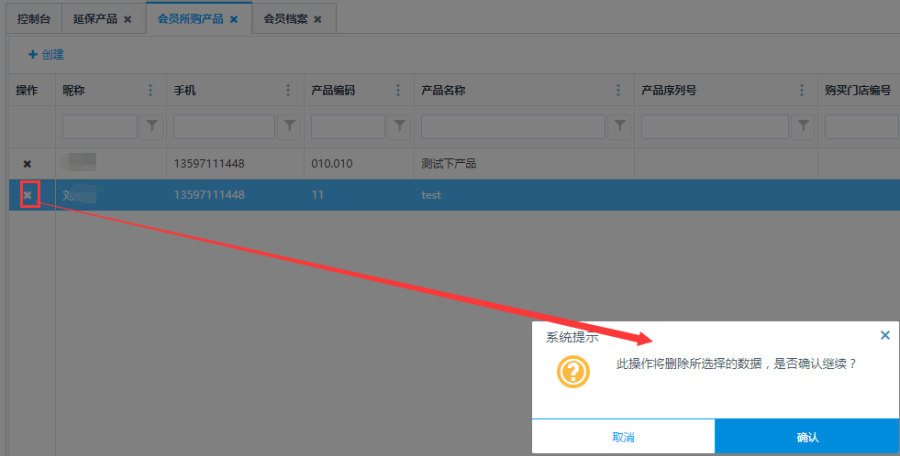 点击操作栏中的<删除>按钮,可对会员所购产品进行删除操作。