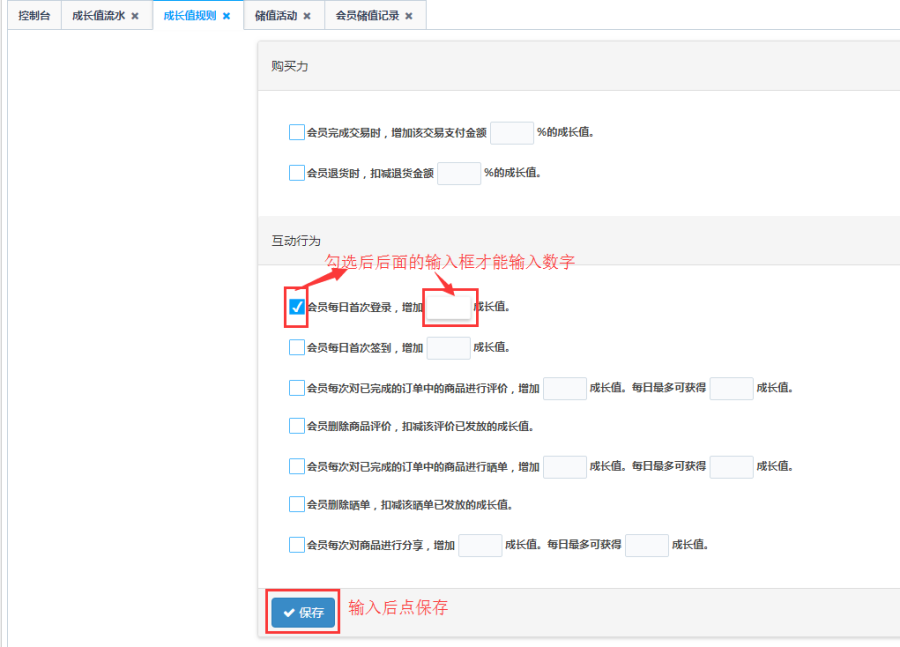 点击左边成长值规则菜单,在右边页面填写信息后保存。