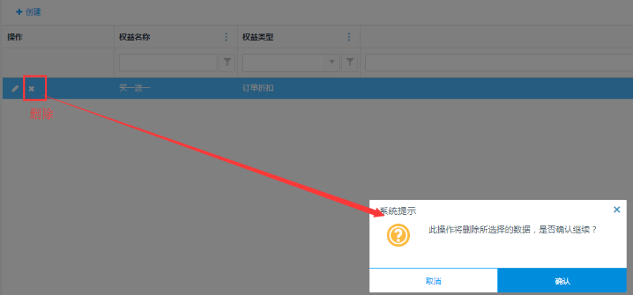 点击<编辑>按钮,弹出会员权益的编辑页面,编辑信息后点击保存,编辑成功;点击<删除>按钮,可删除会员权益。