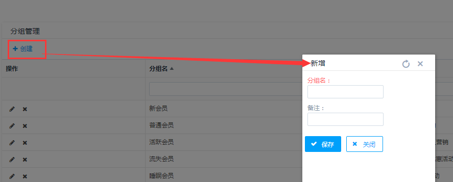 第二步:弹出创建框,填写信息后点击保存,分组创建成功。