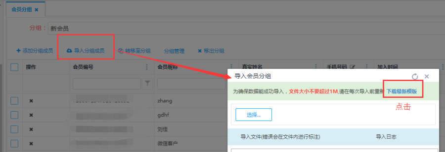 第一步:点击<导入分组成员>按钮可批量导入数据,在导入会员分组页面点击<下载最新模板>填写好内容:
