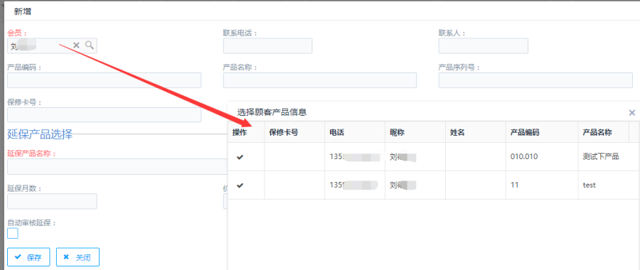 第二步:点击会员,选择会员后会自动带出该会员的所购产品,勾选产品后会自动带出产品信息。