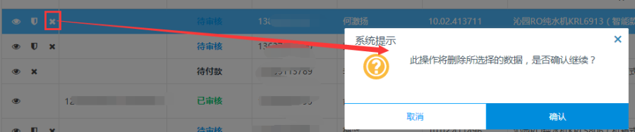 待付款或者待审核的产品延保,可对产品延保进行删除操作,点击<删除>按钮,点击提示上的确认按钮,删除记录;点击取消,则不删除。