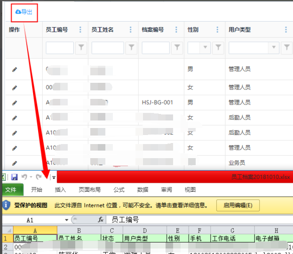 点击列表上方的<导出EXCEL>按钮可导出员工档案列表所有内容。