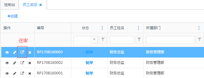 点击<送审>按钮,将员工奖惩提交给上级审批,送审之后,申请单的状态变为"待审批",不能再进行修改或删除操作。