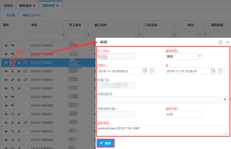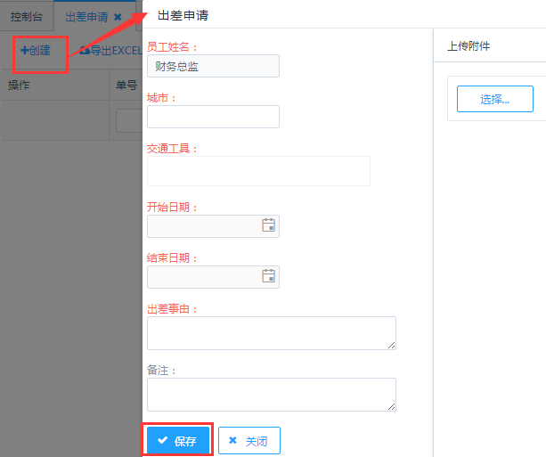 点击<创建>按钮,进入申请界面,填写好请假信息(红色标签为必填)后点击<保存>按钮即可。