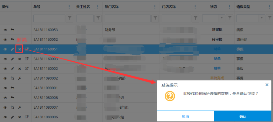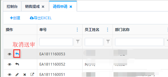 "待审批"状态的请假申请单,可以点击操作栏的<取消送审>按钮,申请的状态将变为"制单状态"。可以进行修改或删除操作