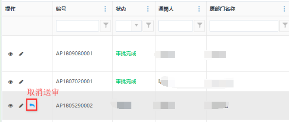 "待审批"状态的调岗申请单,可以点击操作栏的<取消送审>按钮,申请的状态将变为"制单状态"。可以进行修改或删除操作
