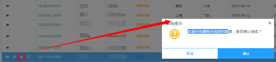 制单状态的订单,可以对订单进行删除操作。点击<删除>按钮,弹出提示,点击提示上的<确认>按钮,删除该条记录;点击提示上的<取消>按钮,则返回不删除。