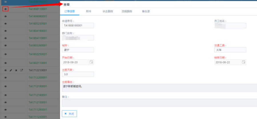 所有状态的订单,点击<查看>按钮,查看界面包括:订单信息、附件、状态跟踪、流程跟踪、备忘录等信息;