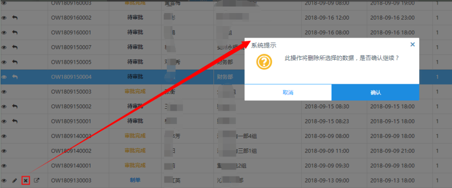 制单状态的订单,可以对订单进行删除操作。点击<删除>按钮,弹出提示,点击提示上的<确认>按钮,删除该条记录;点击提示上的<取消>按钮,则返回不删除。