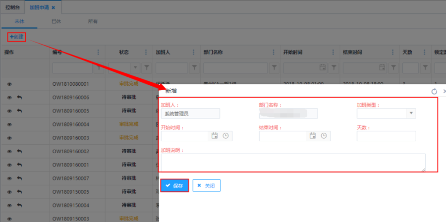 点击左上角的<创建>按钮未休加班记录,也可以切换到已休加班记录补创建以前的记录,在给出的弹框中填写加班信息后保存。