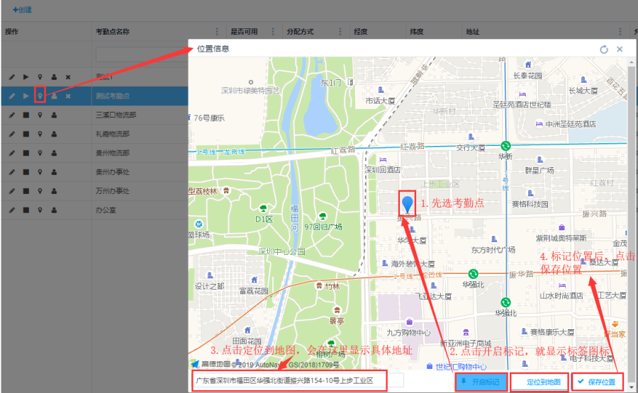 第一步:点击<定位>按钮,弹出一个弹框展示地图,先在地图上找到考勤点的位置,然后点击<开启标记>按钮,再单击刚刚确定好的考勤点位置,点击的地方便会显示一个地址标签(参考图里的1和2步骤所示)。