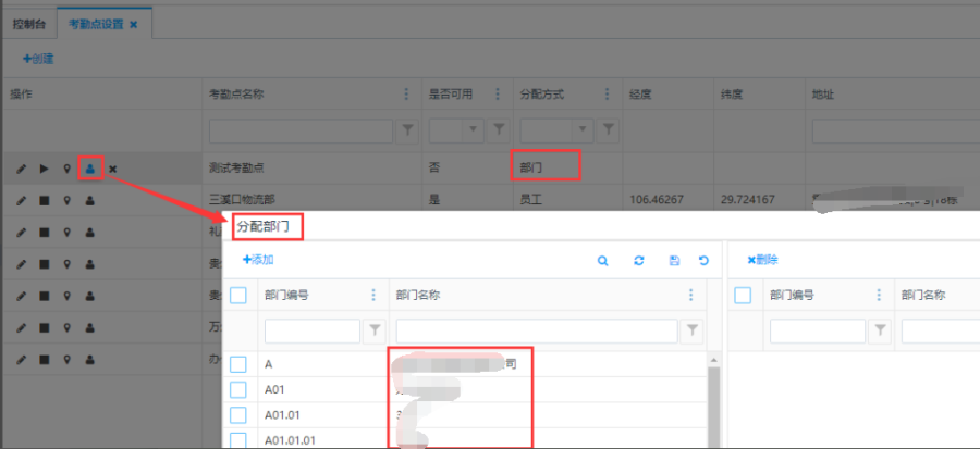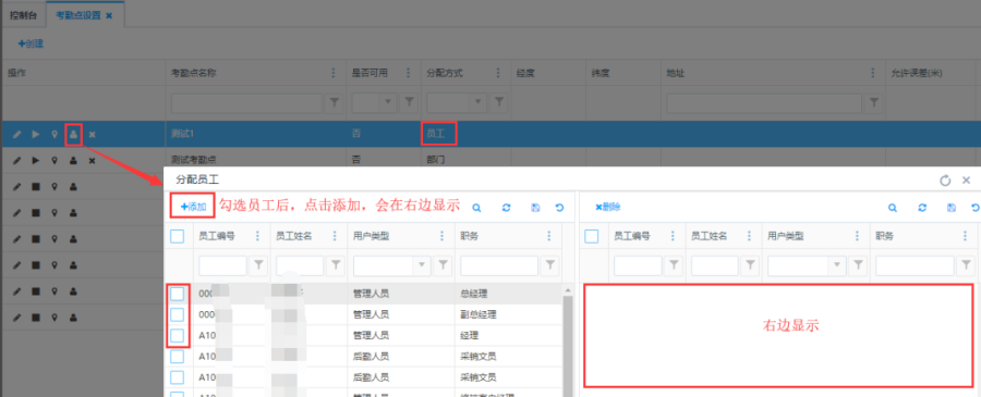 点击<分配>按钮。在给出的弹框中选中要分配的员工/部门后点击<添加>按钮。添加成功后会在右边界面显示;在右边,显示不需要的员工/部门,点击<删除>按钮,可将员工/部门移除。