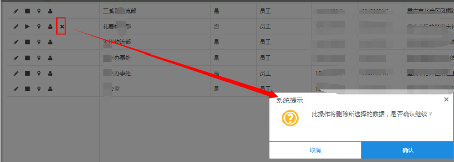 停用状态的考勤点,可以对订单进行删除操作。点击<删除>按钮,弹出提示,点击提示上的<确认>按钮,删除该条记录;点击提示上的<取消>按钮,则返回不删除。