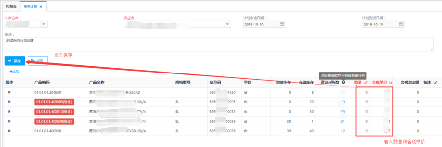 第四步:填写订单的产品【数量】和【含税单价】后点击<保存>,采购计划订单创建成功并返回采购订单主页面。