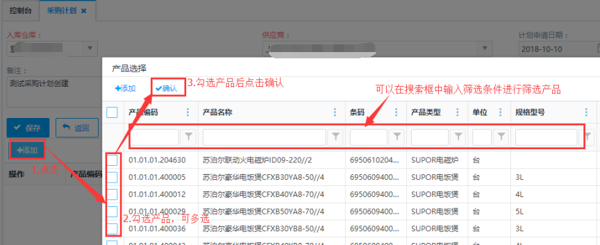 第三步:点击<添加>之后在弹出界面勾选需要的选择产品编码,勾选后点击确认按钮,添加产品到列表中。