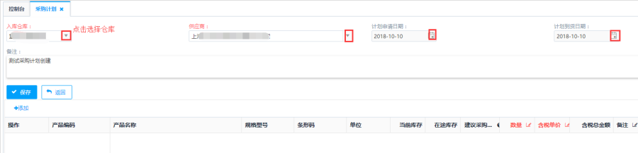 第二步:根据订单详情对单据信息进行填写,选择【入库仓库】、【供应商】、【计划申请日期】、【计划到货日期】后点击<保存>按钮
