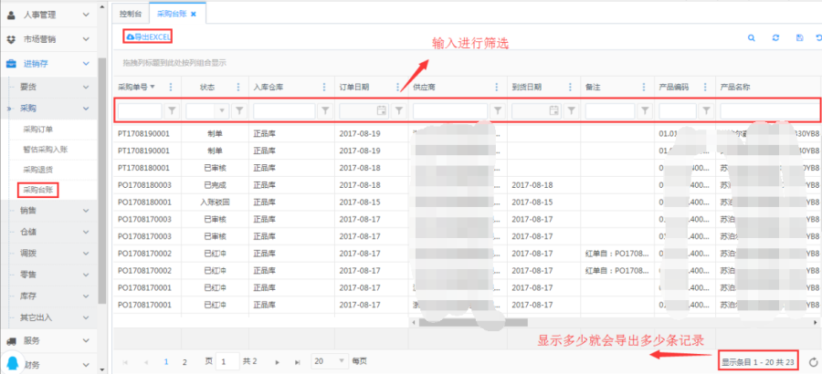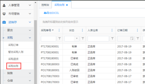 访问路径:进销存—采购—采购台账