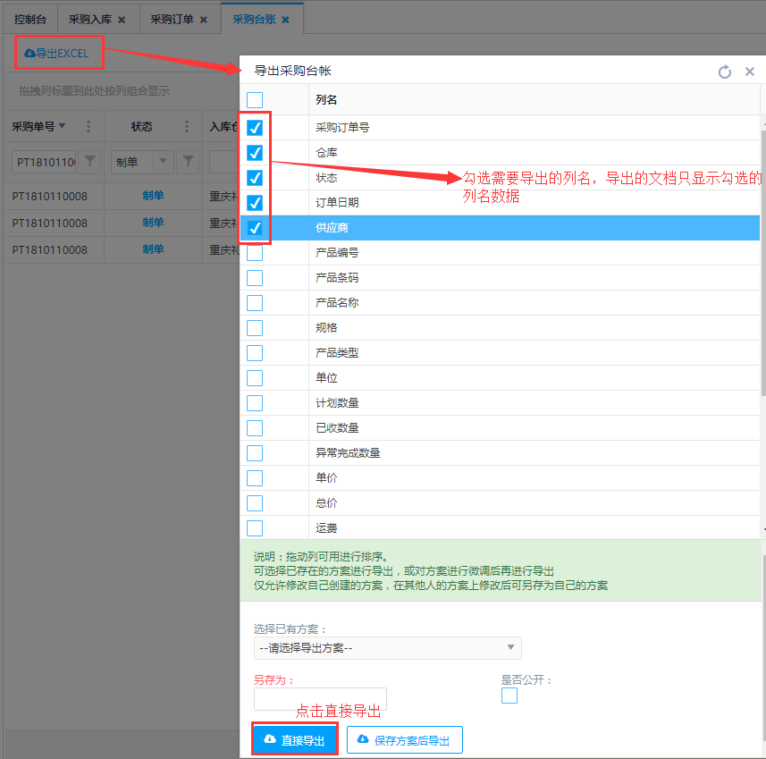 - 3.导出时选择需要导出的列名字段进行导出,导出后的文档只显示选择的列名数据。