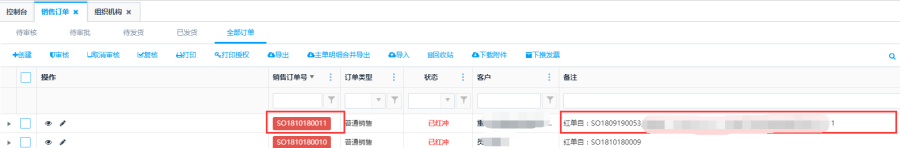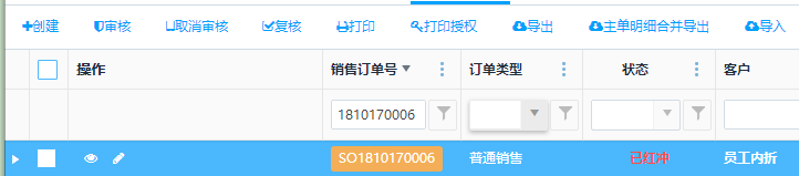 - 订单明细如果均已红冲或关闭,订单自动转为已红冲,并且会自动生成一条红冲的销售订单
