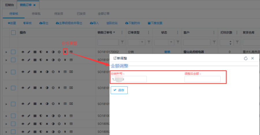 制单和待审批状态下的销售订单,可以点击<价格调整>按钮,可对订单进行价格调整操作,调整后应收金额和客户应付金额显示调整后的金额。