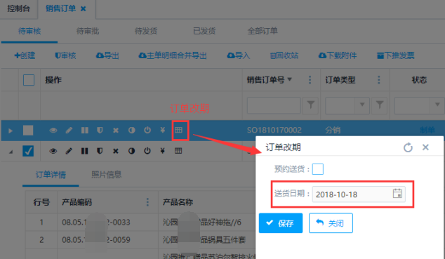 制单和待审批状态下的销售订单,可以点击<订单改期>按钮,可对订单进行订单改期操作。