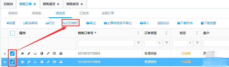 当单据超过限定的打印次数后,想再次打印时,勾选需要的单据后然后点击<打印授权>后方可打印。
