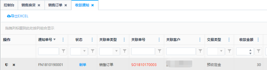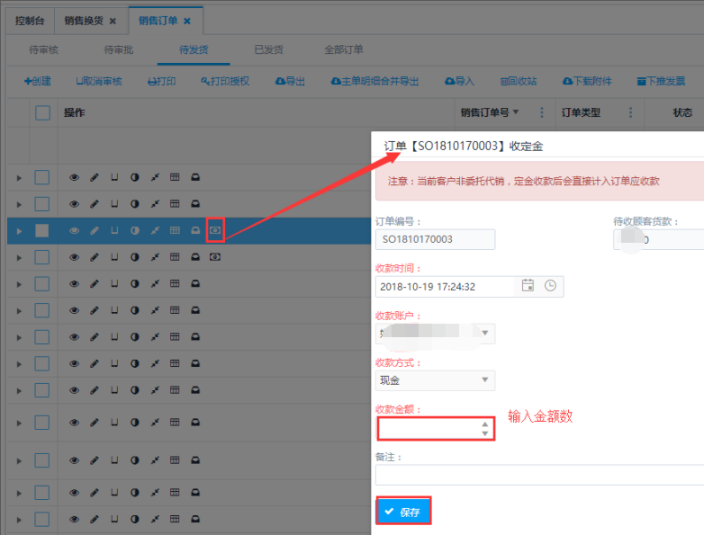 已审核/已发货的销售订单,可以点击操作栏<收定金>按钮,跳转到收定金界面,输入收款金额后点击<保存>按钮,保存成功后会自定生成一条收款通知单(从财务-资金管理-收款通知处查看)
