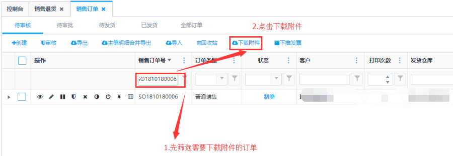 点击列表上方的<下载附近>按钮可下载销售订单里的附件。