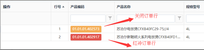 - 产品列表关闭订单行:关闭当前销售订单的产品行,关闭后产品列表不能操作并且产品编码显示黄色;(仅针对已审核的订单)