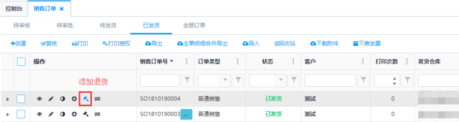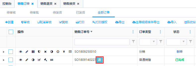 添加退货针对的是【已审核】【已完成】状态下的销售订单进行退货操作。